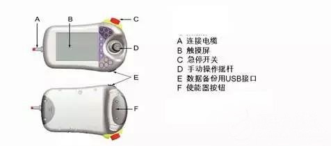 上圖是ABB機(jī)器人示教器,其中A是示教器與控制柜之間的連接電纜,B是觸摸屏,C是急停開關(guān),D是手動操縱桿,E是數(shù)據(jù)備份與恢復(fù)用USB接口(可插U盤/移動硬盤等存儲設(shè)備),F(xiàn)是使能按鈕。